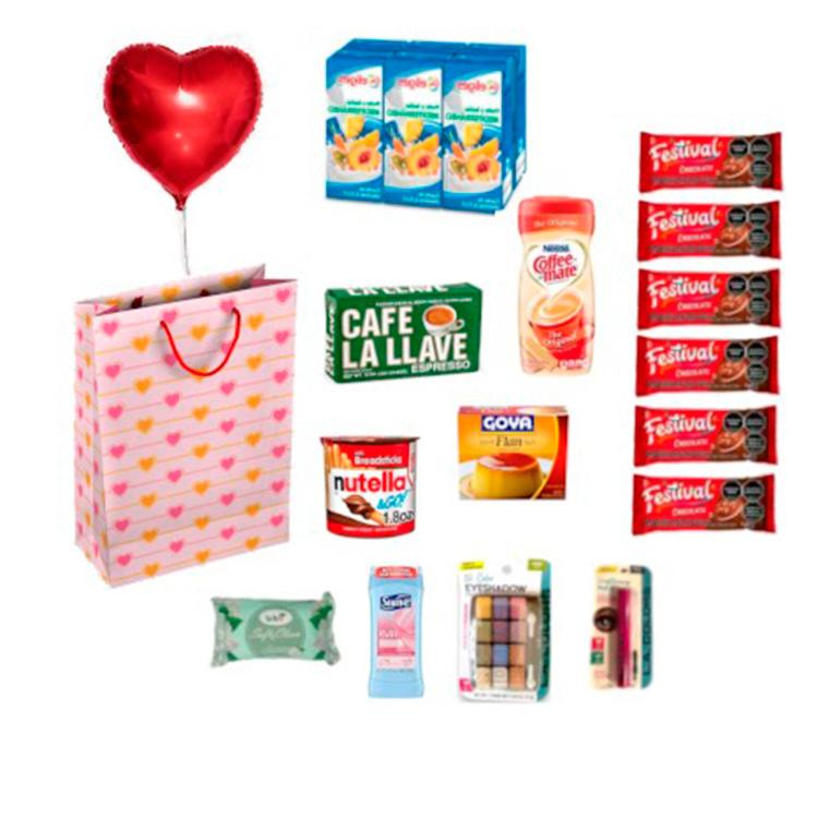Nutella & Go 51gFlan 57gGalletas de Chocolate Festival 6uni x33.6gCafé La llave 284gCoffe Mate 311gJugos 200ml x 6uniJabón de Tocador 125gDesodorante Suave 34gPaleta de sombra para los ojos (6colores variados)Máscara de PestañasGlobos en forma de Corazón Bolsa de Regalo