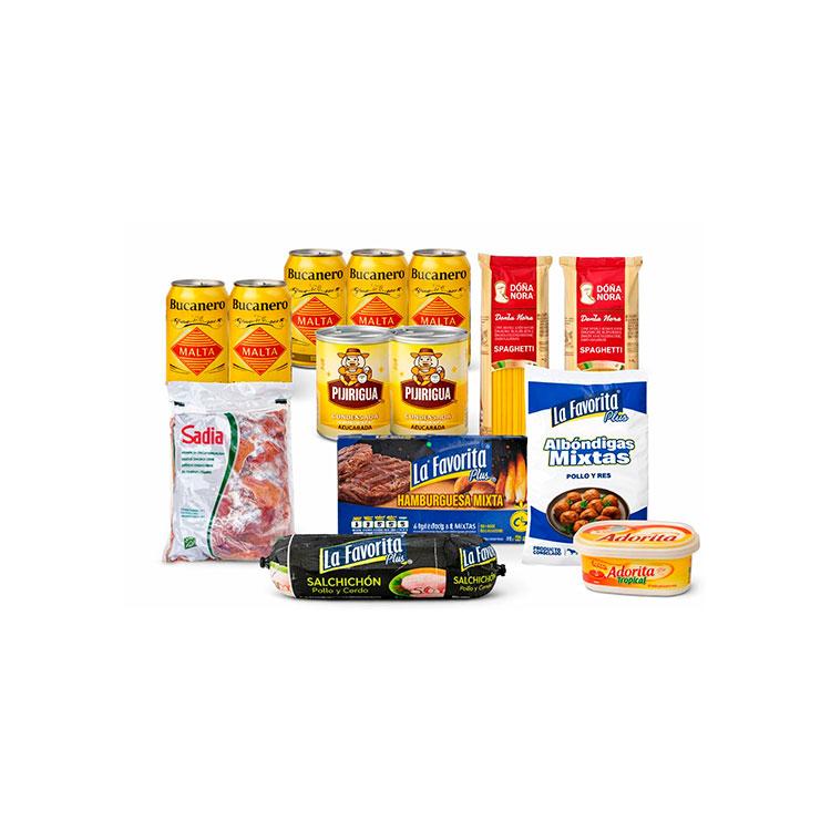 5 maltas 2 espaguetis 250g 2 leche consensada 390g 1 higado de pollo 1kg 1 salchichón  1 albóndiga 1 mantequilla 1 hamburguesa